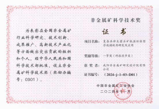 2024年11月6-7日,中国非金属矿工业大会在广东茂名召开,大会进行了“2024年度非金属矿科学技术奖”颁奖,其中咸阳非矿院的“复杂共伴生萤石矿低温环保型浮选捕收剂研发及应用”成果获得科技进步类一等奖、“玻璃纤维用白云石粉研发与标准制定”成果获得科技公益类二等奖。