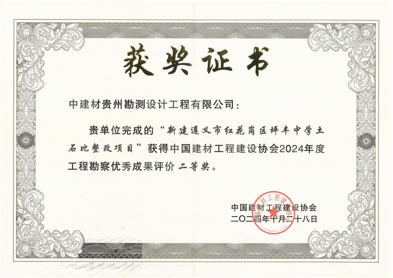 近日,中建材贵州勘测设计工程有限公司实施的“新建遵义市红花岗区坪丰中学土石比整改项目”荣获中国建材工程建设协会2024年度工程勘察优秀成果评价二等奖。