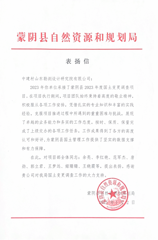 2025年1月2日,公司地理信息中心蒙阴县2023年度国土变更调查项目组收到蒙阴县自然资源和规划局表扬信。信中强调,在项目执行期间,公司项目团队始终秉持着高度的敬业精神,积极服从各项工作安排,凭借扎实的专业知识和丰富的实践经验,克服项目推进过程中所遇到的重重困难与挑战,展现了卓越的业务能力和务实的工作态度,按时、保质、保量完成了上级交办的各项工作任务,工作成果得到了各方的高度认可和好评,为蒙阴县国土管理工作提供了坚实的数据支撑和有力保障。对项目部全体同志:余亮、李红艳、范军杰、唐劲、郭立君、王梦远、姬珊珊、王晓霞等,提出表扬。