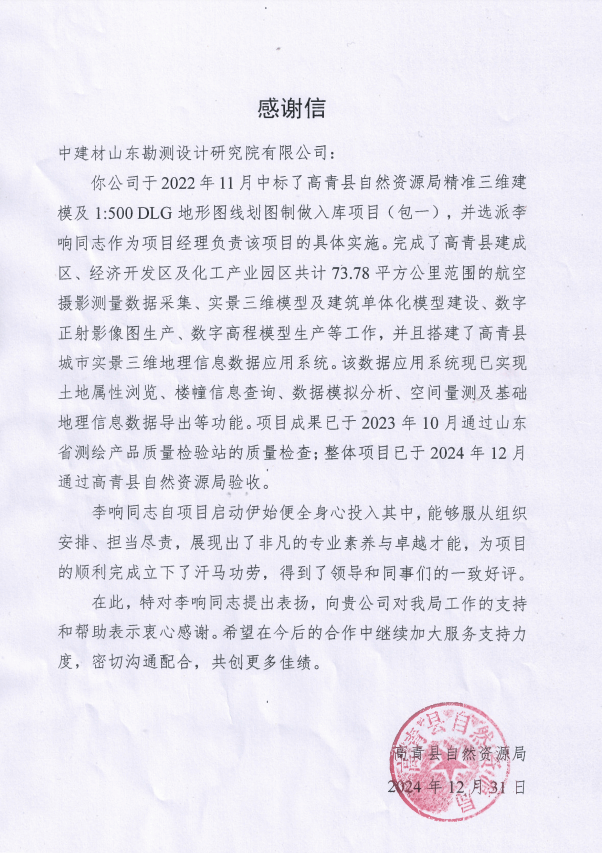 2024年12月31日,地理信息中心李响收到高青县自然资源局感谢信,高度肯定了李响同志作为项目经理负责该项目具体实施期间,完成了高青县建成区、经济开发区及化工产业园区共计73.78平方公里范围的航空摄影测量数据采集、实景三维模型及建筑单体化模型建设、数字正射影像图生产、数字高程模型生产等工作;搭建了高青县城市实景三维地理信息数据应用系统;系统实现了土地属性浏览、楼幢信息查询、数据模拟分析、空间量测及基础地理信息数据导出等功能,顺利通过了高青县自然资源局验收。