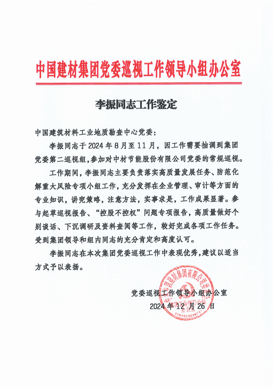 2024年12月26日,经营管理部李振收到中国建材集团党委巡视工作领导小组办公室工作鉴定。文件指出,李振同志在抽调参与集团党委第二巡视组常规巡视期间,充分发挥在企业管理、审计等方面的专业知识,讲究策略,注意方法,实事求是,工作成果显著,较好完成各项工作任务,受到集团领导和组内同志的充分肯定和高度认可。