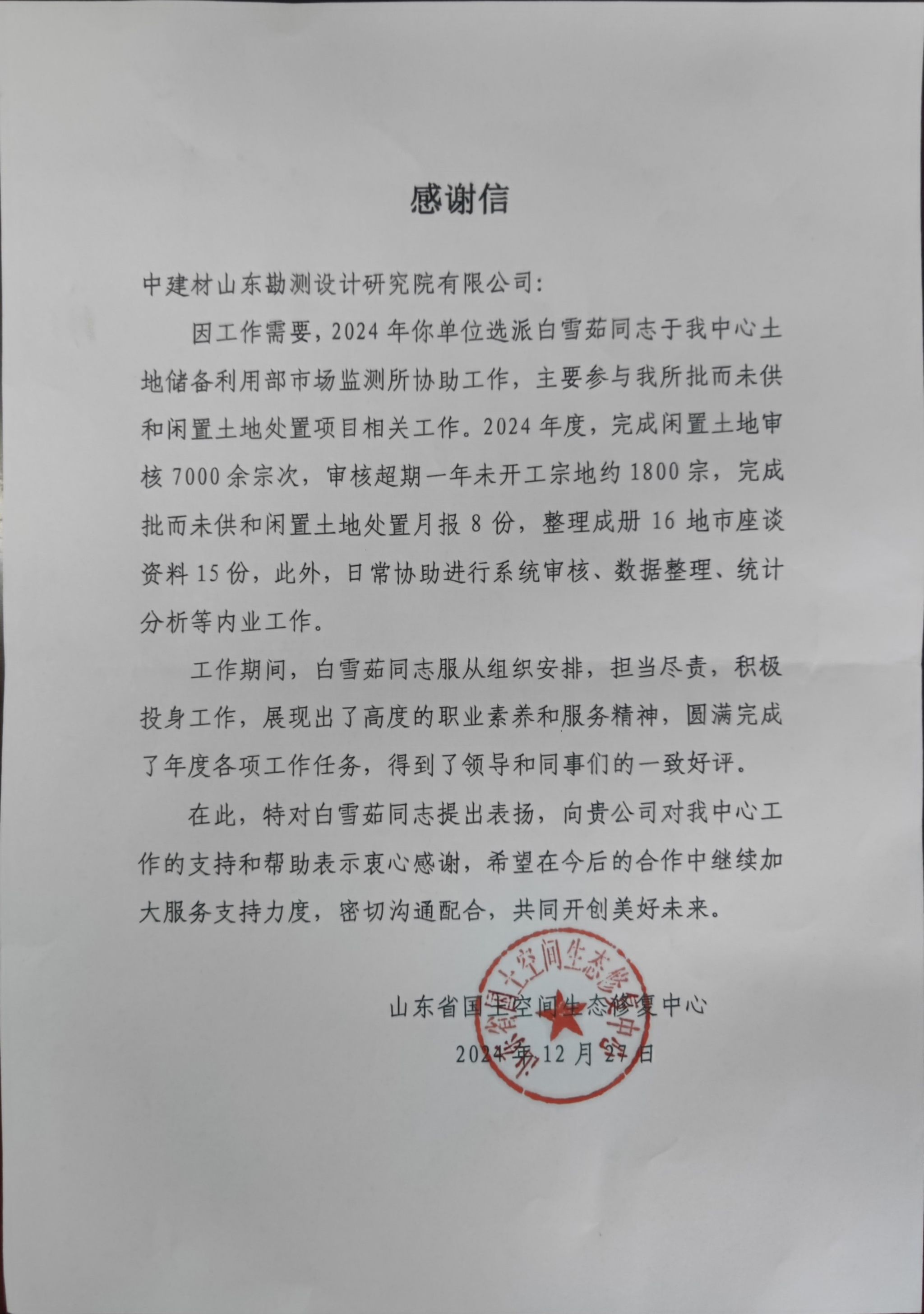2024年12月27日,地理信息中心白雪茹收到山东省国土空间生态修复中心的感谢信。来信表示,白雪茹同志2024年度完成闲置土地审核7000余宗次,审核超期一年未开工宗地约1800宗,完成批而未供和闲置土地处置月报8份,整理成册16地市座谈资料 15份,同时协助进行系统审核、数据整理、统计分析等内业工作。工作期间,服从组织安排,担当尽责,积极投身工作,展现出了高度的职业素养和服务精神,圆满完成了年度各项工作任务,得到了领导和同事们的一致好评。