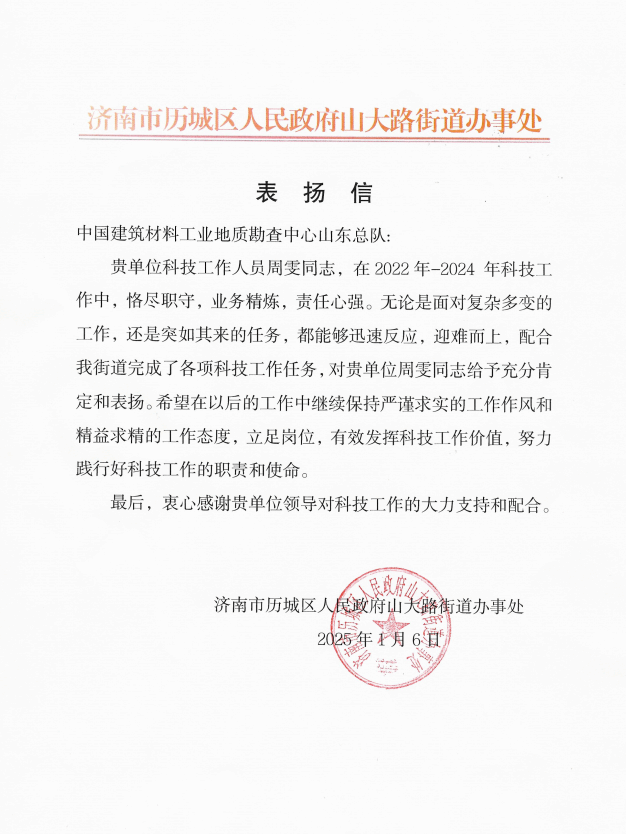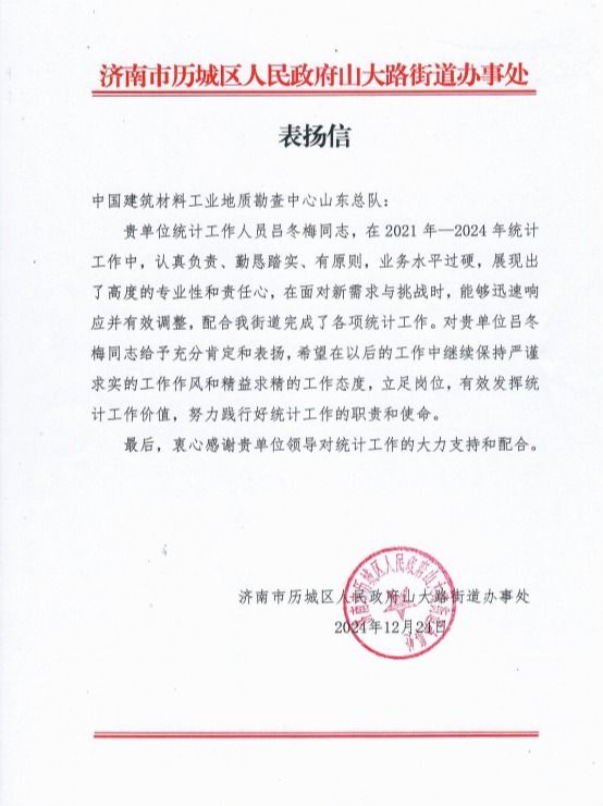 2024年12月24日,经营管理部吕冬梅、科技管理部周雯收到济南市历城区山大路街道办事处表扬信??隙肆矫驹诠ぷ髦?,认真负责、勤恳踏实、恪尽职守、业务精炼,有高度的专业性和责任心,在面对新需求与挑战时,能够迅速响应并有效调整,配合山大路街道完成了各项工作。