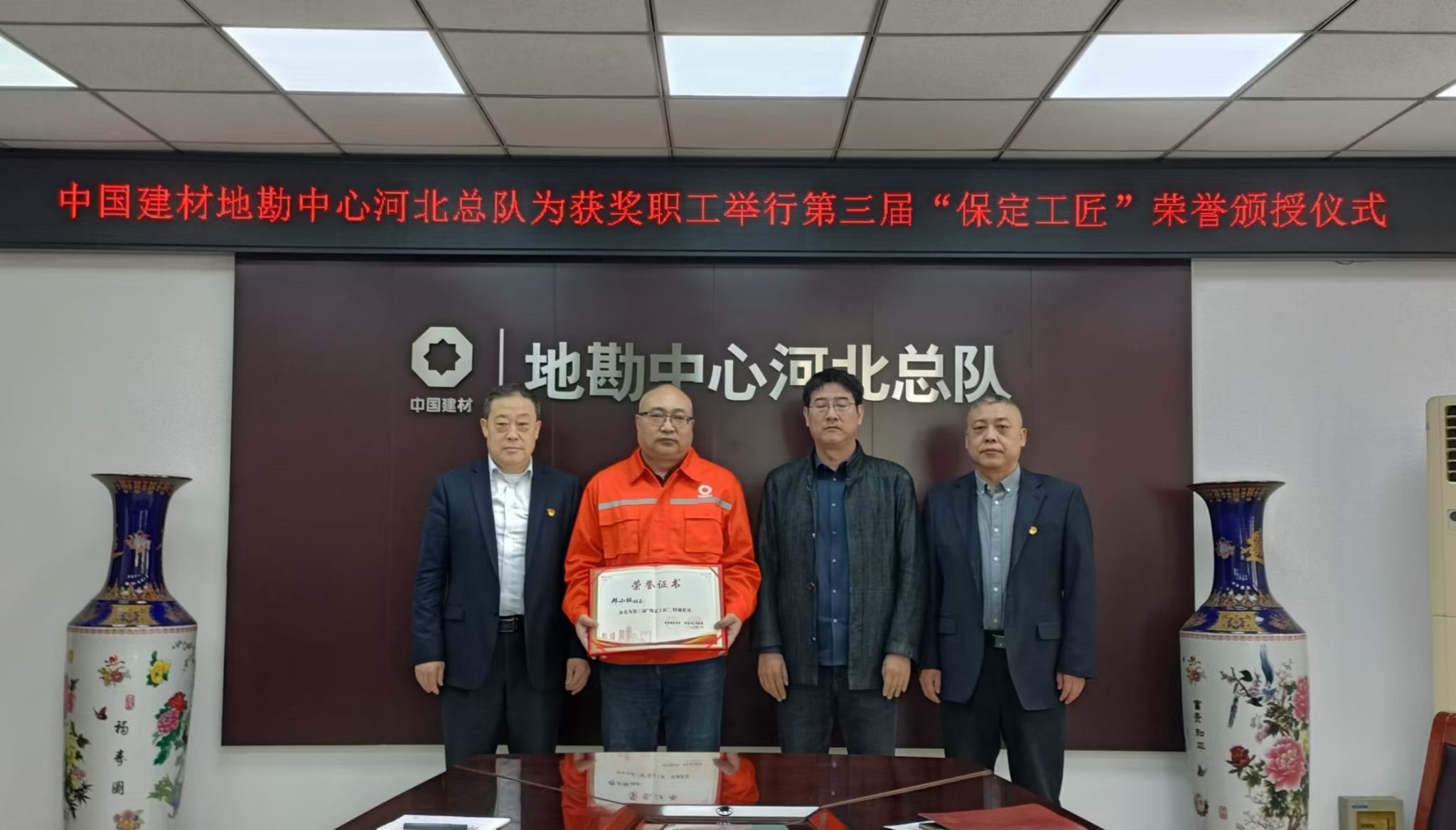 3月13日,河北总队为荣获“保定工匠”荣誉职工邢小枫同志举行颁授仪式。河北总队部分领导班子成员、中层干部代表及地勘院全体职工参加仪式。