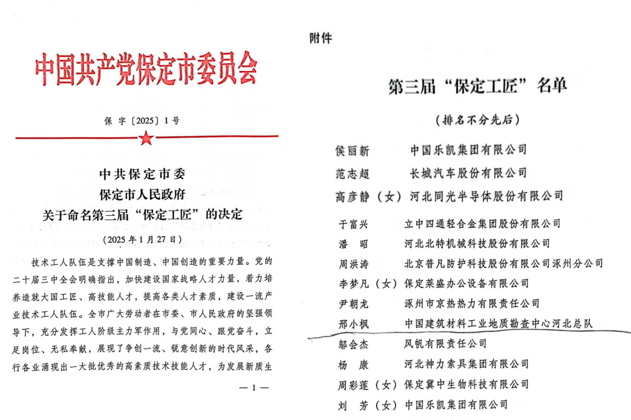 大会宣读了中共保定市委、保定市人民政府联合下发的《关于命名第三届“保定工匠”的决定》。根据该决定,邢小枫同志被保定市委、市政府正式授予“保定工匠”荣誉称号,这是总队职工首次获此殊荣,开启了总队荣誉新篇章。
