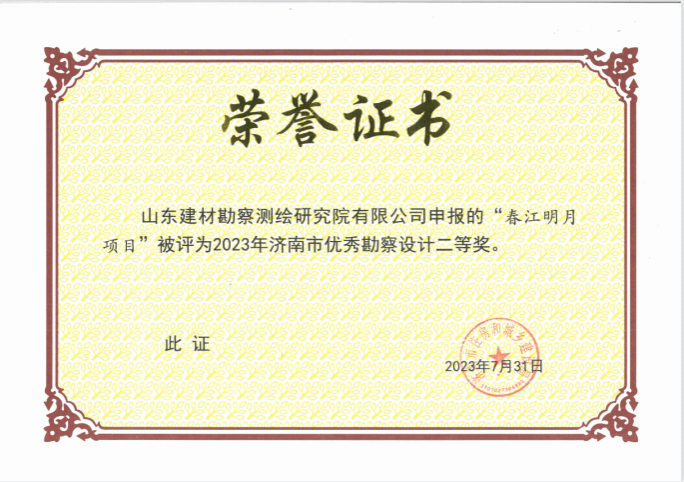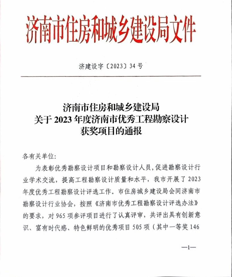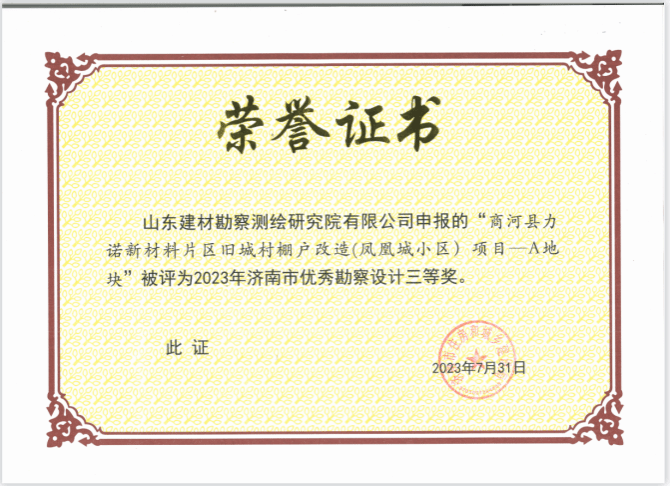 近期,济南市勘察设计行业协会发布了《2023年度济南市优秀工程勘察设计评选获奖项目公示》,中建材山东勘测设计研究院有限公司(原山东建材勘察测绘研究院有限公司)春江明月项目荣获二等奖,商河县力诺新材料片区旧城村棚户改造(凤凰城小区A地块)项目荣获三等奖。