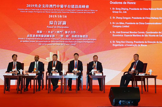 宋志平在“央企‘ +澳门’携手合作、高质量参与葡语国家和‘一带一路’基础设施建设”的综合论坛上分享了集团参与葡语国家和“一带一路”建设,在基础设施、国际产能合作等领域的成果和经验,其观点受到与会嘉宾的赞赏和一致认可。论坛由中国电力建设集团副总经理李燕明主持,中国铁路工程集团董事长张宗言,中国交通建设集团董事长刘起涛,佛得角圣维森特岛海洋经济特区主任Jose Emanuel,澳门建造商会理事长邓汉昌一同参加。