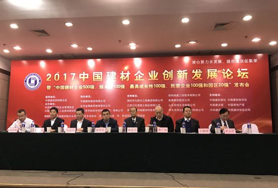 10月26日,由中国建筑材料企业管理协会、中国建筑材料工业规划研究院组织召开的“2017中国建材企业创新发展论坛暨2017中国建材企业500强、建材服务业100强、民营建材企业100强、最具成长性建材企业100强和中国建材园区20强发布会”在京举行。中国建材集团荣获“2017中国建材500强”首位;中国建材总院荣获“2017中国建材服务业100强”第一名;凯盛科技夺得“2017中国最具成长性建材企业100强”状元;中国玻璃新材料科技产业园当选“2017中国建材园区20强”首批单位。 中材国际、中建材进出口、中材进出口、中国建材工程、中建材国际贸易、天津水泥院、中材节能、合肥院、中材装备、瑞泰科技、中建投物流、中建投、CTC等获得“2017中国建材服务业100强”称号;北新建材、中材科技、巨石集团、中国复材、中材金晶、中材高新、中国联合水泥、南方水泥、西南水泥、南方新材料、泰山石膏、祁连山水泥等均在“2017中国最具成长性建材企业100强”之列。
