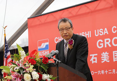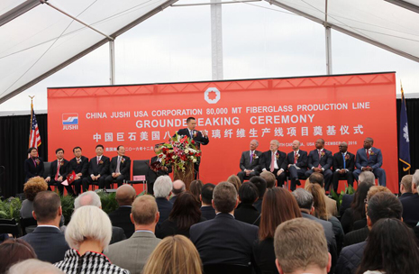 张毓强在致辞中讲到,巨石美国项目的建设,是中国巨石继埃及项目之后,为加快企业全球布局做出的又一项重大战略决策。一期项目总投资3亿美元,玻纤年产能8万吨,本着工厂前移、研发前移、人才前引、就地生产、靠近客户、贴近市场、以外供外的总体原则进行建设,计划于2018年建成投产。项目将采用世界上最先进的环保技术,将努力实现经济效益和社会效益的双丰收。他表示,美国是玻璃纤维的发源地,也曾是全球最大的玻纤生产国和消费国,更是中国巨石最大的海外市场。美国玻纤工业专业化水平高、市场领域广、各类资源丰富、发展前景乐观,选择在美国建厂,一方面说明了中国巨石实施“布局国际化、市场全球化”战略,进一步融入国际市场的坚定信心,另一方面也证明了作为行业领军者的中国巨石,已经具备了在全球任何国家建设世界一流玻纤生产线的实力和能力。