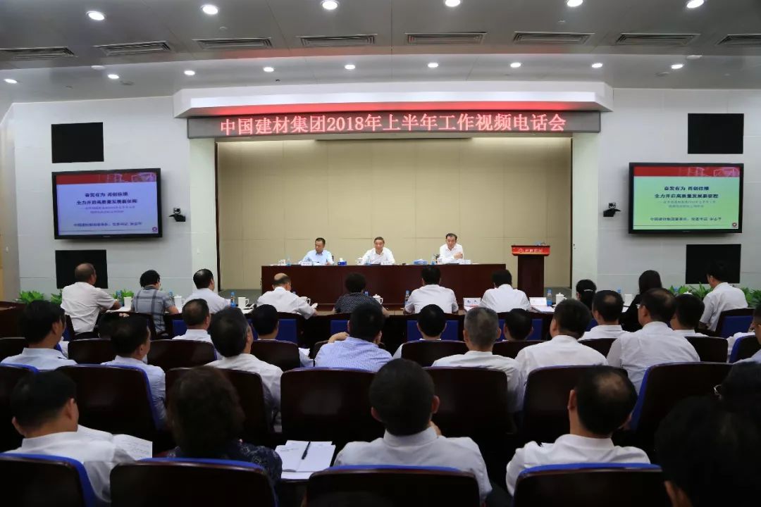 7月19日,中国建材集团召开2018年上半年工作视频电话会议,深入学习习近平新时代中国特色社会主义思想和党的十九大、十九届二中、三中全会精神,贯彻落实中央企业、地方国资委负责人视频会议精神,分析形势,交流经验,总结上半年工作,研究部署下半年工作。中国建材集团董事长、党委书记宋志平作了题为“奋发有为 再创佳绩 全力开启高质量发展新征程”的重要讲话,副董事长、党委副书记刘志江主持会议并作会议总结讲话,总经理曹江林作了题为“凝心聚力 再接再厉 勇创集团改革发展历史新纪录”的半年工作报告。