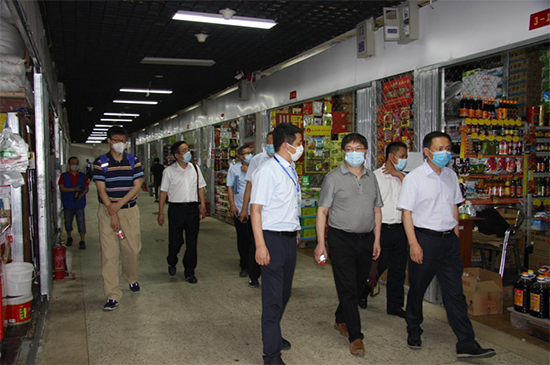 王于猛一行先后考察了粮油调料大厅、精品水果大厅、冷冻品大厅、农产品零售配送大厅和便民扶贫蔬菜集中交易区,着重察看经营区防疫措施落实和现场安全管理情况。在北京市疫情出现反复的关键时期,市场严格按照北京市关于农贸市场防控指引要求,及时修改完善疫情防控预案,对商户和顾客实行进门、进厅双重体温监测,查验健康宝,严格落实戴口罩进场和戴手套经营措施,坚持全区域每日两次消毒。王于猛对这些措施表示肯定,并详细询问了商户经营、防疫防控、安全生产等情况。