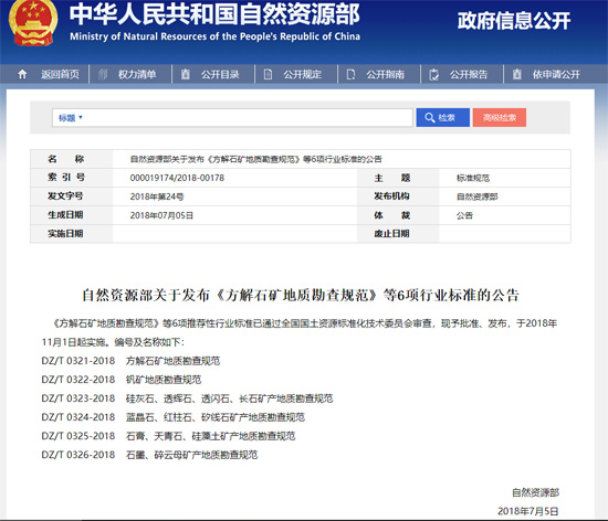 0324-2018)、《石膏、天青石、硅藻土矿产地质勘查规范》(DZ/T 0325-2018)、《石墨、碎云母矿产地质勘查规范》(DZ/T 0326-2018)等四个行业标准由自然资源部2018年7月5日批准发布,将于2018年11月1日起正式实施。