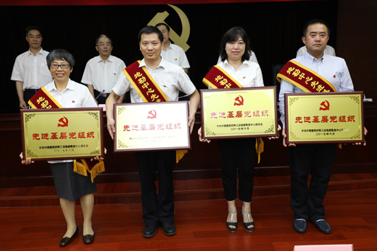 吴岩宣读了地勘中心党委关于表彰地勘中心“两优一先”的决定,地勘中心领导班子成员分别向8个先进基层党组织、13名共产党员和4名党务工作者颁发了奖牌和证书。