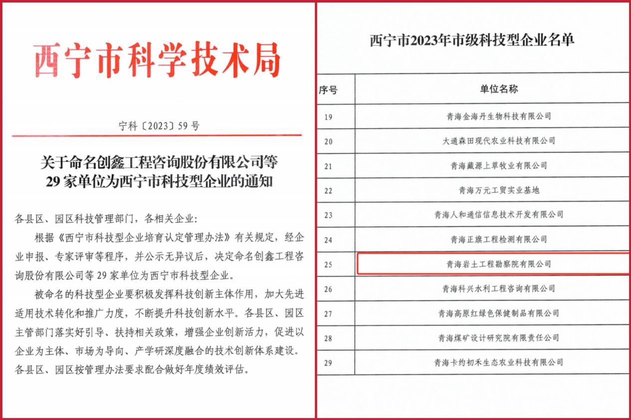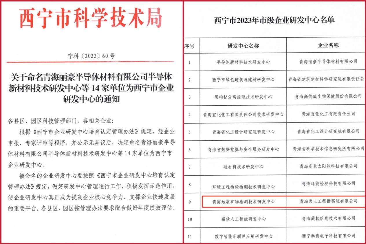 近日,西宁市科学技术局发布了《关于命名创鑫工程咨询股份有限公司等29家单位为西宁市科技型企业的通知》(宁科〔2023〕59号)和《关于命名青海丽豪半导体材料有限公司半导体新材料技术研发中心等14家单位为西宁市企业研发中心的通知》(宁科〔2023〕60号),公布了符合2023年西宁市科技型企业、西宁市企业研发中心培育认定的企业名单。青海总队子公司青海岩土工程勘察院有限公司申报的“西宁市科技型企业”和“青海地质矿物检测技术研发中心”榜上有名。