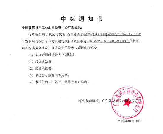 1月30日,广西总队经过激烈的角逐,成功中标贺州市八步区黄洞乡石门村花岗岩矿矿产资源开发利用与保护总体方案编写项目,中标金额七百余万元,为总队迎来了本年度的开门红。