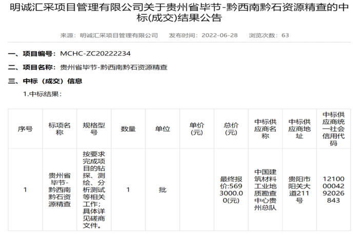 6月28日,中国建筑材料工业地质勘查中心贵州总队通过贵州省政府采购平台,通过竞争性磋商成功中标贵州省自然资源厅“贵州省毕节-黔西南黔石资源大精查”项目,中标合同总金额569.3万元。