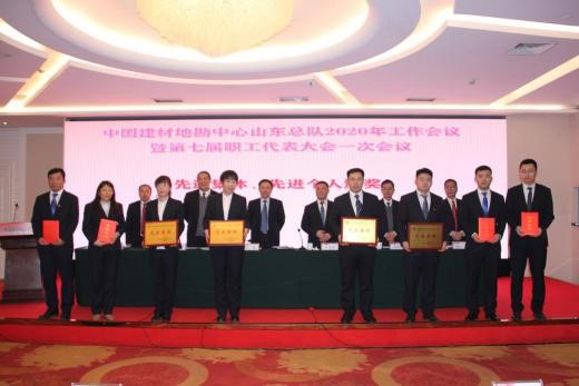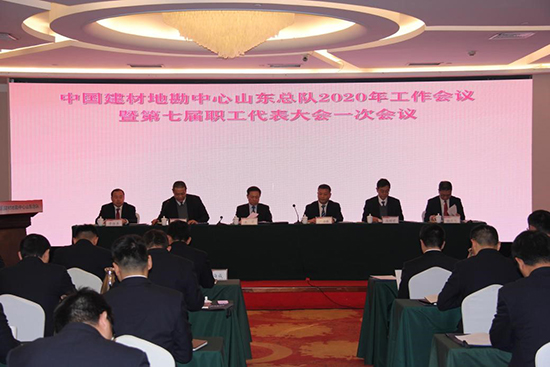 地勘中心综合办公室主任汤昉,总队、勘测院有限公司及中建材江苏公司山东分公司中层以上干部、工会职工代表共计60余人参加了工作会议。