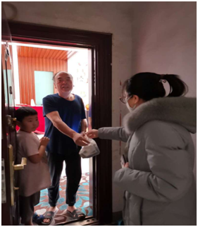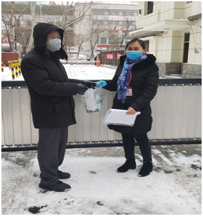 总队职工龚世锋的爱人段芸,是水磨沟区城市管理局派驻水磨沟区南湖北路管委会百万庄社区的访惠聚工作队队员,自1月30日起驻守在社区一直未回家,每日忙碌着为辖区居民购买药品、各类生活物资,为居民提供日常生活物资保障工作。