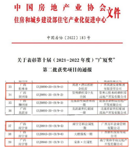 在12月27日中国房地产协会、住房和城乡建设部住宅产业化促进中心联合发布的第十届(2021-2022年度)“广厦奖”第二批获奖项目名单中,广西9个项目获奖,可喜可贺!值得一提的是,此次获奖的9个项目中,“兴进·漓江郡府金桂府”“贺州碧桂园中央公园”“南宁万科公园里一期”“荣和·公园里”4个项目的工程勘察工作均由我总队所属建材桂林地质工程勘察院有限公司(下称“勘察院”)承担。