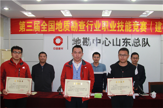 安徽总队选手郑明辉(右一)荣获“全国地质勘查行业职业技能竞赛(建材赛区)”二等奖