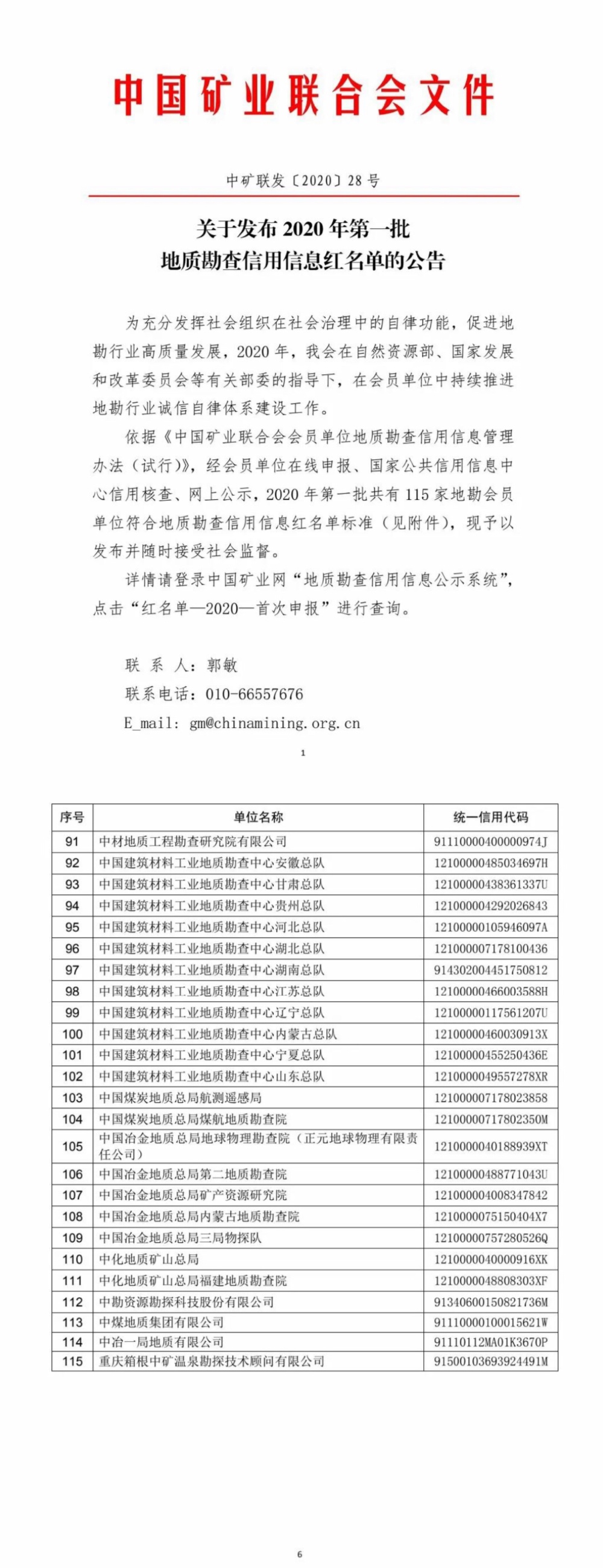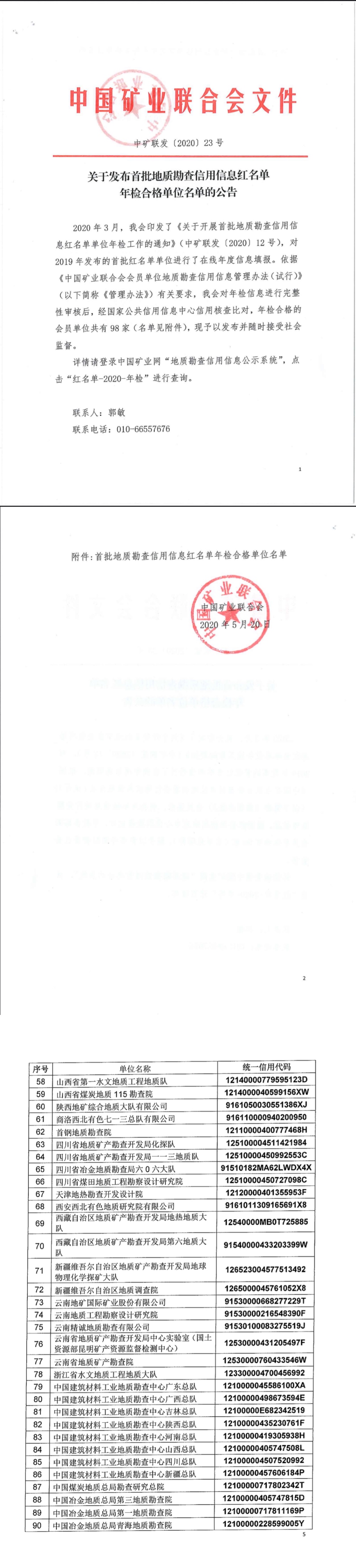 近日,中国矿业联合会公布了98家首批地质勘查信用信息红名单年检合格单位和2020年第一批115家地质勘查信用信息红名单。地勘中心共有20家地勘单位成功入选红名单,其中:广东总队、四川总队、陕西总队等8家单位顺利通过红名单年度检查;地勘院、辽宁总队、安徽总队等12家单位首次入选2020年第一批地质勘查信用信息红名单。