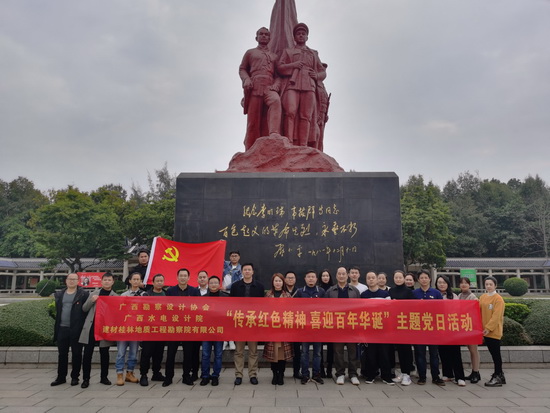为喜迎中国共产党百年华诞,12月29日,广西总队下属工勘院联合广西勘察设计协会以及广西壮族自治区水利电力勘测设计研究院有限责任公司(以下简称“广西水电设计院”)开展“传承红色精神 喜迎百年华诞”主题党日活动。活动主要包括参观李明瑞、韦拔群烈士纪念馆,以及参观广西水电设计院并进行座谈。