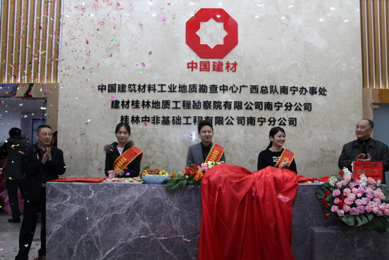 2017年12月23日是个喜庆的日子——广西总队南宁办事处(简称南宁办事处)、总队所属建材桂林地质工程勘察院有限公司南宁分公司(简称南宁分公司)乔迁办公新址,新址位于南宁市良庆区金龙路2号万科大厦。总队领导成员,办公室、财务部负责人,建材桂林地质工程勘察院有限公司部分中层以上领导,南宁办事处、分公司全体员工参加了迁址庆典仪式。广西工程勘察专业委员会秘书长王桂强、广西住建厅调研员黄克明,广西岩土协会理事长张信桂,南宁市勘测院总工梁俊勋,建研地基广西分公司总经理雷阳等众多领导、嘉宾出席庆典活动。