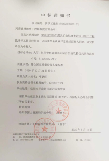奋力拼搏创佳绩,捷报频传奏凯歌。5月13日,河南建材地质环境院在“伊滨区2019年露天矿山综合整治项目施工二标段”的竞标过程中,凭借扎实的专业技术水平,高效的工作作风,卓越的运作团队和良好的企业信誉,以绝对优势顺利中标,中标金额5113.66万元,创河南总队最高中标记录。