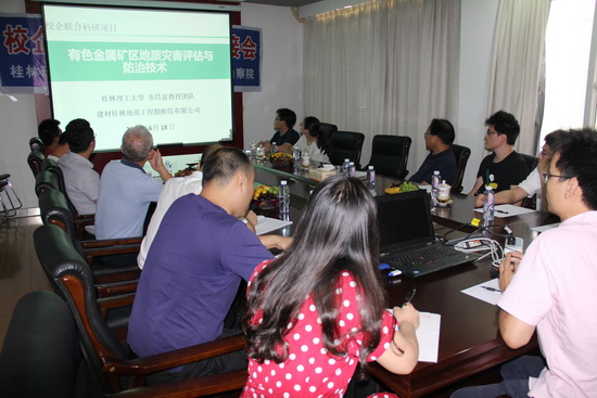 会上,颜荣涛副教授从研究背景、研究内容、研究方案、预期成果、工作基础五个方面进行了初步介绍。研究内容有三个方面:一是尾矿泥浆资源化利用;二是矿区典型地质灾害发生机制,主要针对边坡稳定性和矿泥库稳定性;三是废弃矿区生态恢复技术。目的是依托广西岩土力学与工程重点实验室,通过融合现代化信息技术、监测手段及岩土工程、防灾减灾等学科的最新理论、方法和技术,在深刻揭示复杂条件下岩土介质破坏与变形机理基础上,构建有色金属矿区典型地质灾害的预警预报与评估理论和方法体系,开发地质灾害防治新技术,为广西防灾减灾工作提供技术支撑。经过交流,双方认为,理工大学具备较系统的理论储备和良好的预研基础,广西总队在矿区典型地质灾害发生机制及废弃矿区生态恢复技术方面,有较为丰富的实践经验和项目案例背景,双方具备良好的有互补性与合作基础。双方明确了联合科研联络人,负责合作具体事项的持续推进。
