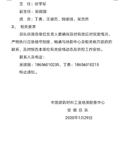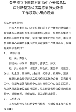 自疫情防控工作开展以来,安徽总队按照集团、地勘中心以及安徽省委省政府工作部署要求,扎实开展疫情防控工作。一是迅速成立应对疫情工作机构,安徽总队于1月29日成立应对疫情工作领导小组,党委书记、总队长许国礼任组长,亲自指示部署相关工作。同时,在总队安全行保部设立应对疫情工作办公室,由领导班子成员带队,每天对总队落实疫情防控相关事项进行全方位督查指导、排查,并实行台账管理,做到早发现早上报,切实筑牢疫情防控墙。