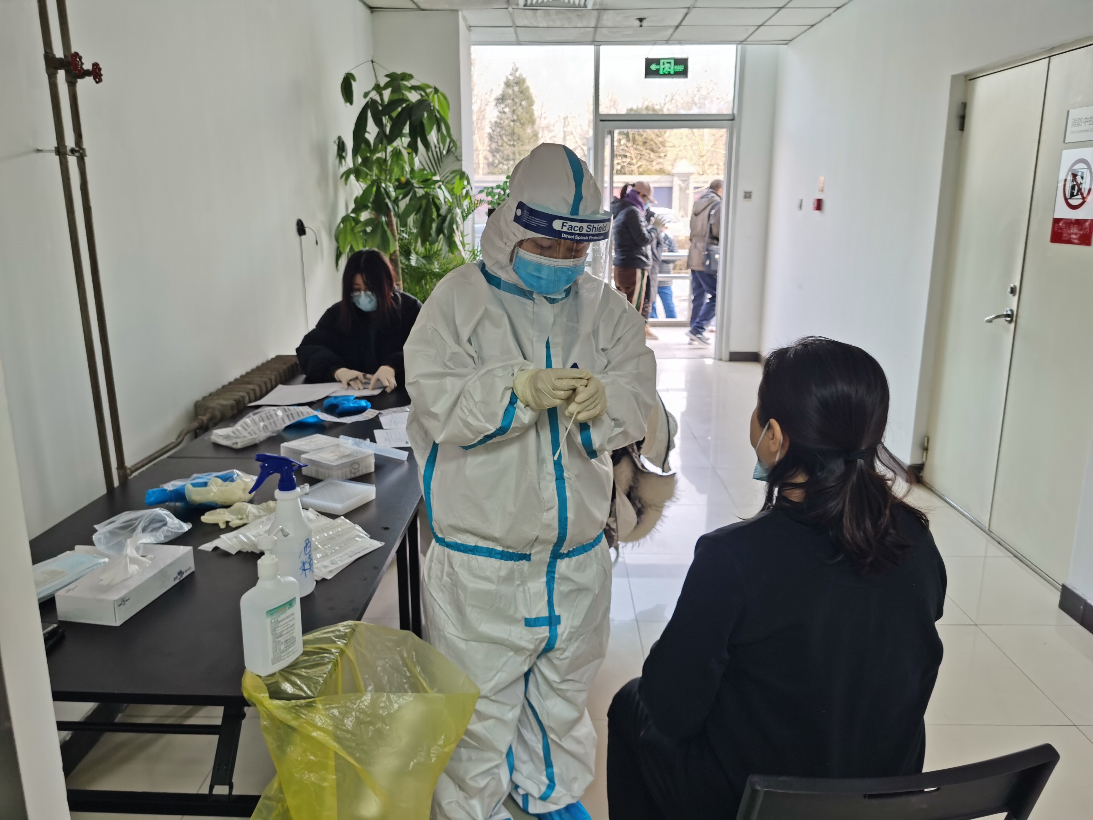 26日,地勘院防疫工作组为避免人员聚集,保证采集质量,对检测现场科学规划、合理布置,不仅设立了单行线路,还设置了等候区、清洁区,员工间隔1米以上有序排队,采样人员均穿戴防护服进行采样;完成检测的人员,在工作人员引导下秩序离场,整个检测过程严谨、高效。