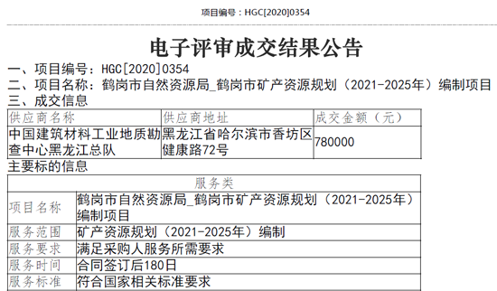 10月28日,黑龙江总队通过黑龙江省政府采购平台,通过鹤岗市政府采购中心竞争性谈判采购方式成功中标“鹤岗市矿产资源规划(2021-2025年)编制项目”,中标价78万元。