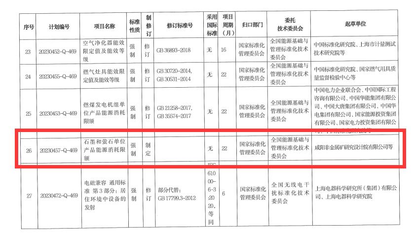 2023年4月3日,国家标准化管理委员会下达了《石墨和萤石单位产品能源消耗限额》强制性国家标准制定计划。该项强制性标准由全国非金属矿产品及制品标准化技术委员会秘书处挂靠单位咸阳非金属矿研究设计院有限公司牵头起草,涉及的主要产品为石墨和萤石。
