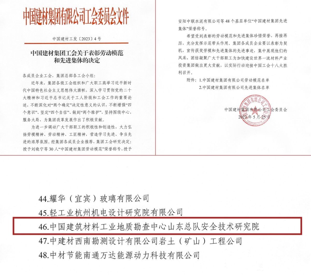 近日,中国建材集团有限公司工会委员会公布《中国建材集团工会关于表彰劳动模范和先进集体的决定》30名个人荣获中国建材集团劳动模范、48个集体荣获中国建材集团先进集体。中国建筑材料工业地质勘查中心山东总队安全技术研究院获“中国建材集团先进集体”荣誉称号。