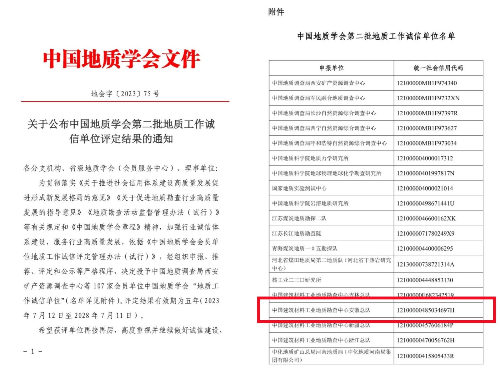 继总队连续3年入选中国矿业联合会“地质勘查信用信息红名单”,本次又获中国地质学会“地质工作诚信单位”认定,是对安徽总队在地勘行业诚信执业的充分肯定,有力提升总队市场竞争力。总队将再接再厉,继续做好诚信体系建设,自觉接受国家、行业主管部门和社会各界监督。