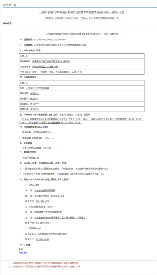 近期,山东总队矿产资源勘查院成功中标“山东省砂石资源专项调查”项目,合同金额224.70万元。