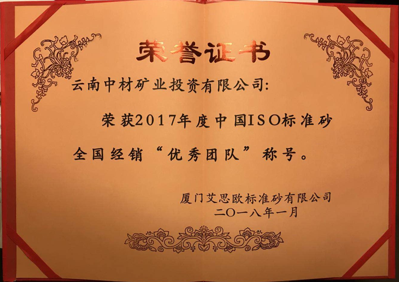 2018年1月11日,厦门艾斯欧标准砂2018年度经销暨管理工作会议在昆明顺利召开,厦门总公司及全国一级经销单位等相关领导、业务负责人员共五十余人参加了会议。云南中材矿业投资有限公司因业绩突出,被厦门总公司授予“2017年度中国ISO标准砂全国经销优秀团队”荣誉称号。