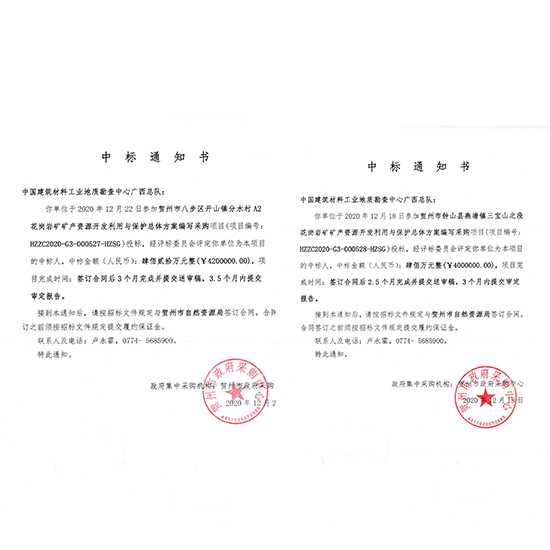12月18日,广西总队成功中标贺州市钟山县燕塘镇三宝山北段花岗岩矿矿产资源开发利用与保护总体方案编写项目,合同金额400万元。三日后,捷报再传,总队再次中标贺州市八步区开山镇分水村A2花岗岩矿矿产资源开发利用与保护总体方案编写项目,合同金额420万元,可谓喜事连连。