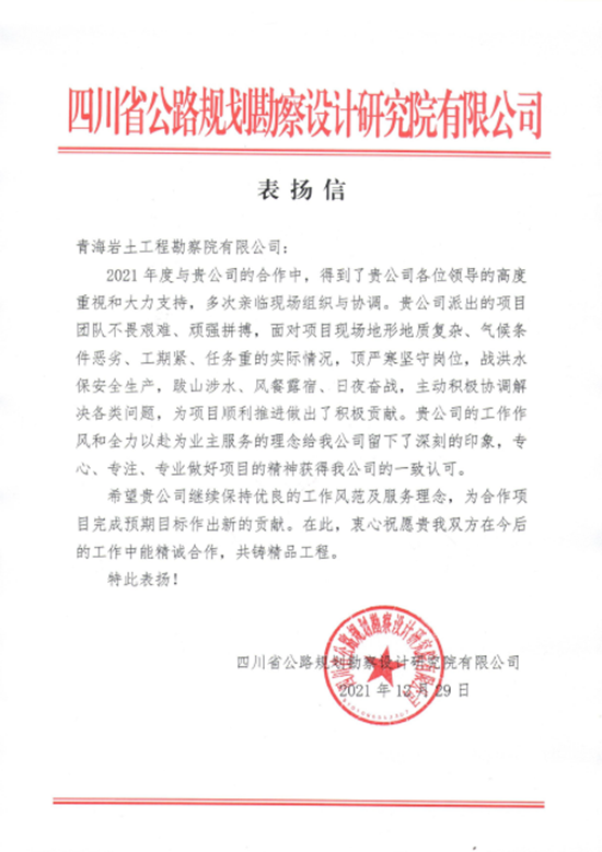 元旦前夕,青海总队子公司青海岩土工程勘察院有限公司收到甲方四川省公路规划勘察设计研究院发来的感谢信,感谢总队及公司对独库项目的高度重视和大力支持,高度赞扬项目部不畏艰险、顽强拼搏的精神,该项目成果也得到了甲方及业主单位的认可和表扬。
