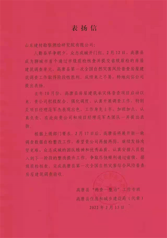 近日,山东建材勘察测绘研究院有限公司地理信息中心承担的高唐县第一次全国自然灾害风险普查房屋建筑调查工作,获高唐县“两查一整治”工作专班及高唐县住房和城乡建设局表扬。