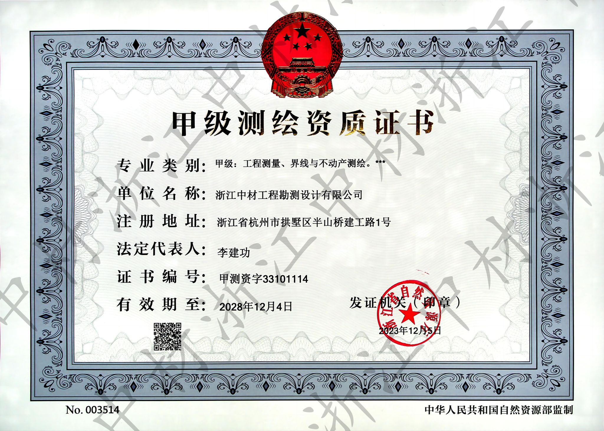 浙江总队积极响应集团和中心企业化改革部署,推动经营性资产资质移入企业化平台。今年7月以来,总队运营部牵头落实资质整合工作,在测绘院、综合办公室、财务部、技术质量部等部门的全力配合下,历经几个月的努力,于2023年12月5日,经浙江省自然资源厅核准,浙江中材工程勘测设计有限公司(中材公司)成功获批甲级测绘资质(工程测量、界线与不动产测绘)。