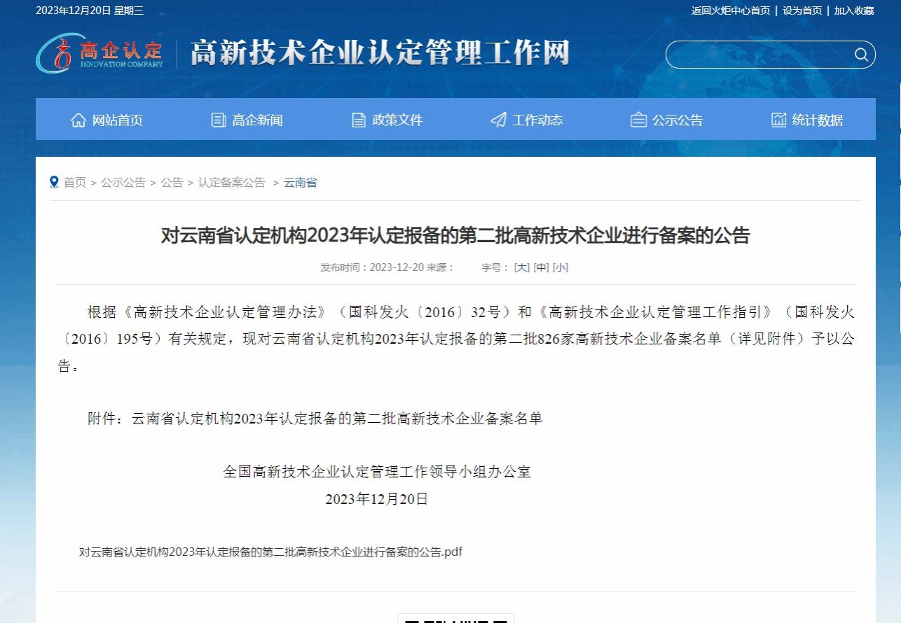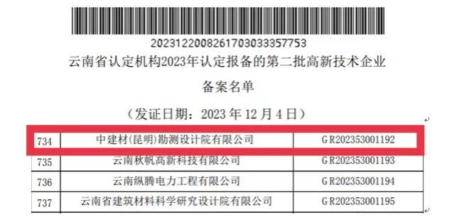 2023年12月20日,全国高新技术企业认定管理工作网发布了云南省认定机构2023年认定报备的第二批高新技术企业备案名单,中建材(昆明)勘测设计院有限公司顺利通过国家高新技术企业认定,成功迈入国家高新技术企业行列。