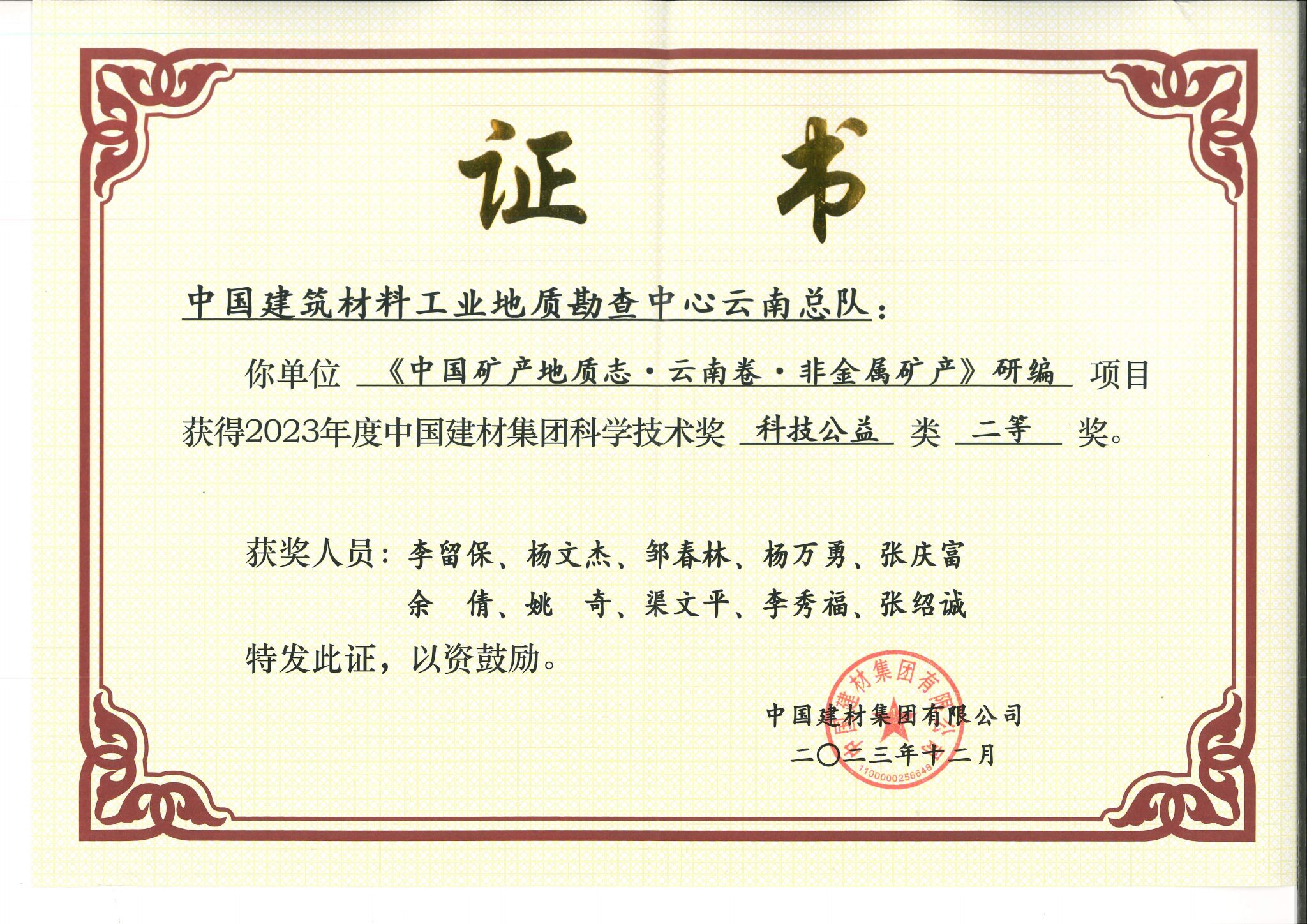近日,中国建材集团有限公司对33个荣获2023年度科学技术奖项目进行了表彰,其中:技术发展类一等奖2项、二等奖2项;技术进步类一等奖8项、二等奖10项;科技公益类一等奖2项、二等奖9项。中国建筑材料工业地质勘查中心云南总队成功入选,荣获科技公益类二等奖。