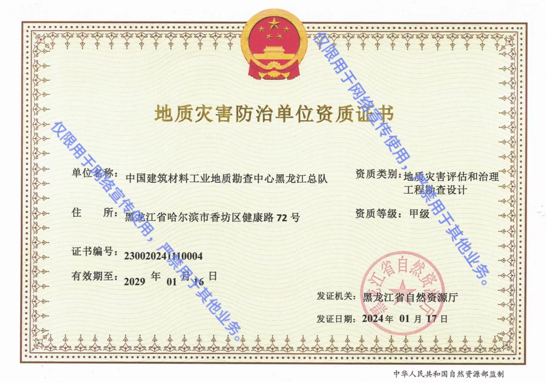 近日,黑龙江总队顺利取得了由黑龙江省自然资源厅颁发的地质灾害防治单位地质灾害评估和治理工程勘查设计资质甲级证书。
