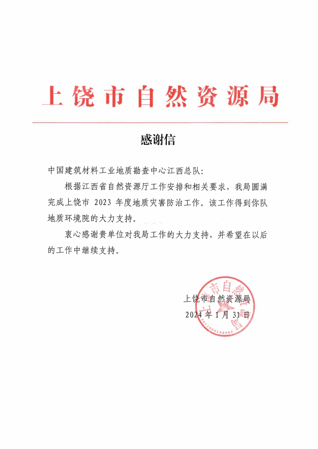 近日,总队地质环境院收到来自上饶市自然资源局感谢信,对总队地质环境院在上饶市2023年度地质灾害防治工作中所做的突出贡献表示感谢。