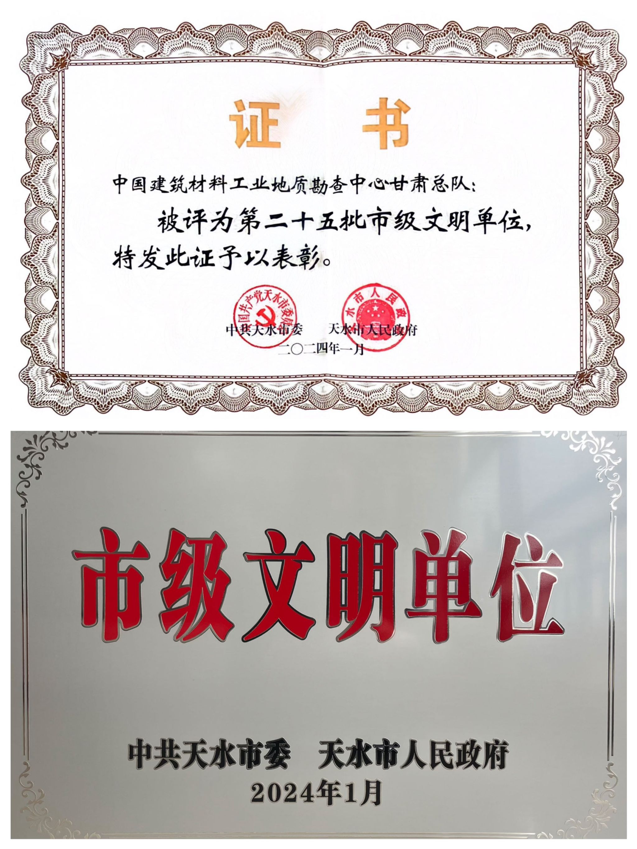 近日,天水市精神文明建设工作会议顺利召开,会上表彰了2023年度全市精神文明建设先进县区和市级精神文明建设先进集体和先进工作者。中国建筑材料工业地质勘查中心甘肃总队荣登榜单,被天水市精神文明建设指导委员会评为天水市 “市级文明单位”。