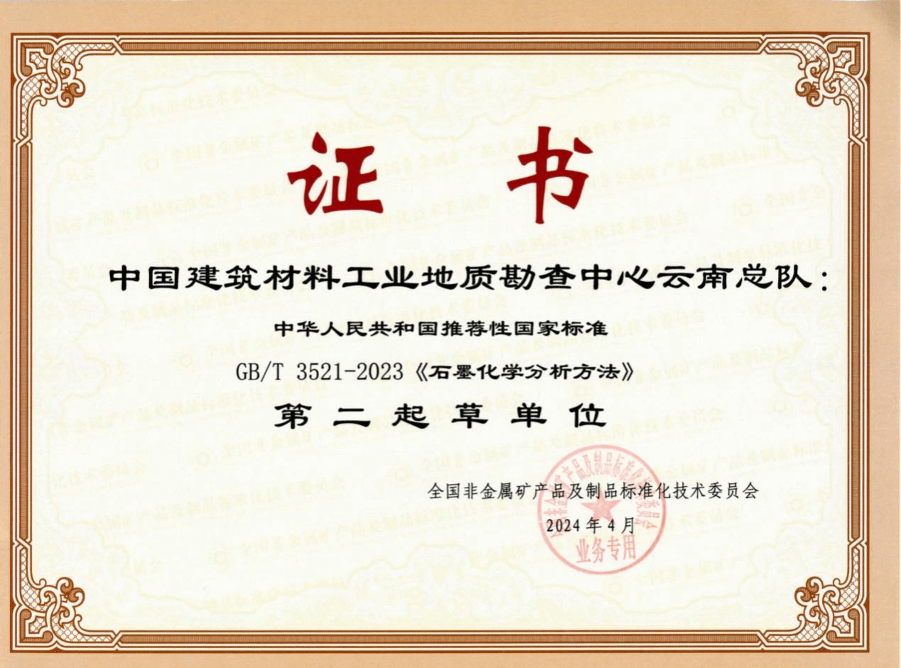 近日,云南总队获颁中华人民共和国推荐性国家标准《石墨化学分析方法》GB/T 3521-2023第二起草单位证书,这是全国非金属及制品标准化技术委员会对我队在石墨领域分析测试业务技术能力的高度认可,也意味着我国石墨化学分析领域在标准化工作方面取得了显著进展。