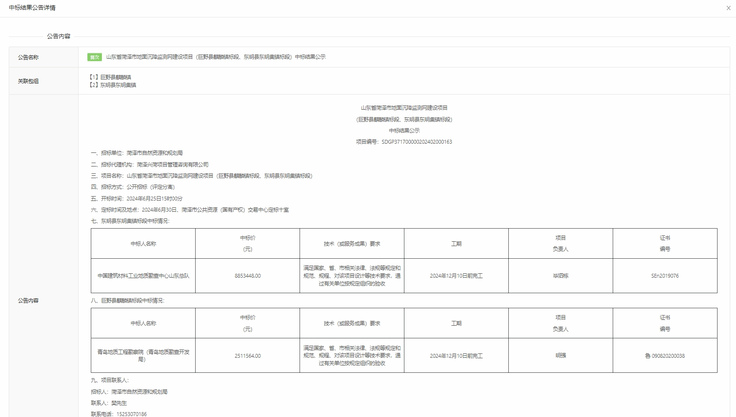 6月30日,山东总队成功中标山东省菏泽市地面沉降监测网建设项目(巨野县麒麟镇标段、东明县东明集镇标段)东明县东明集镇标段,中标金额为885.3万元。