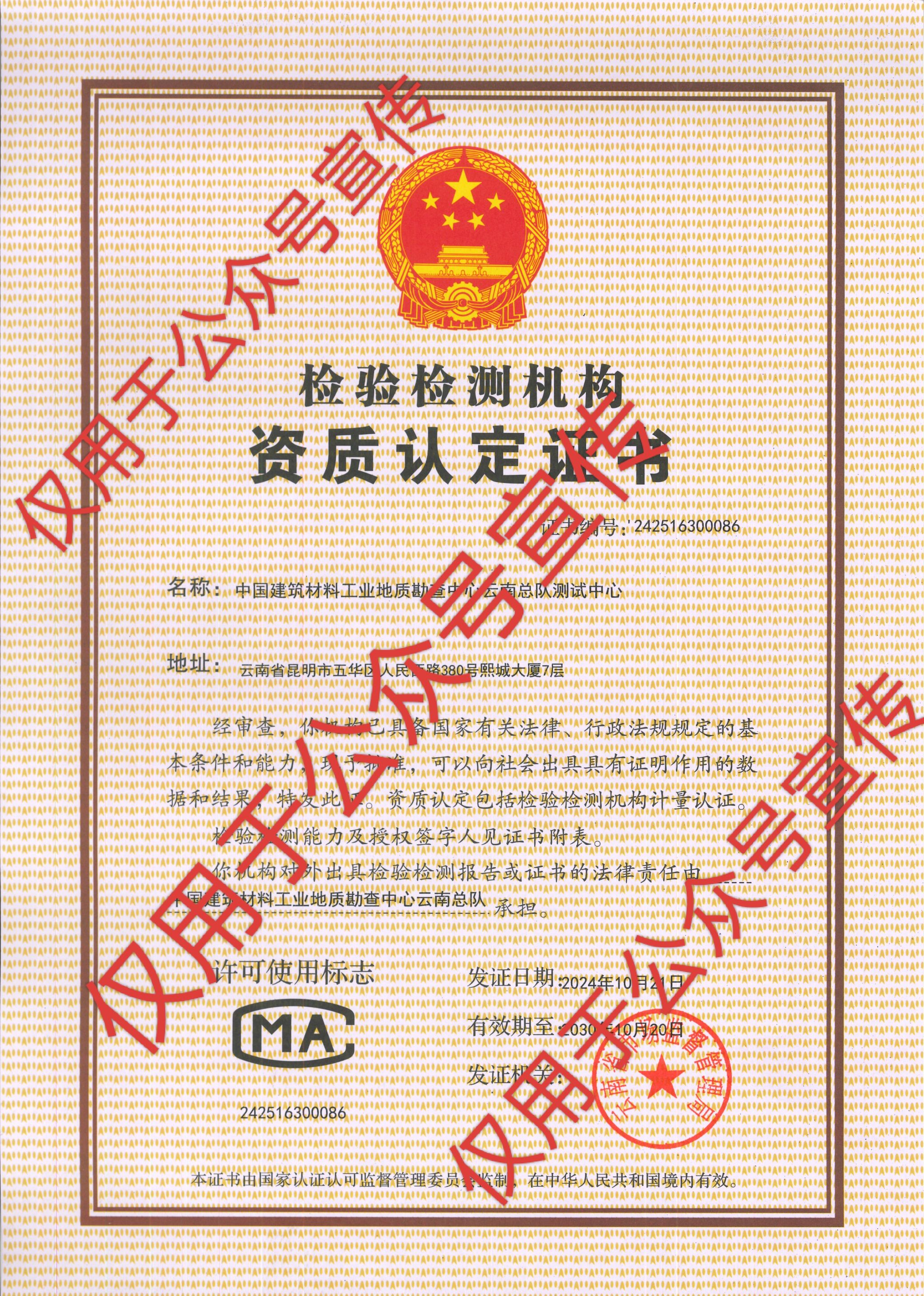 近日,云南总队测试中心通过云南省市场监督管理局检验检测机构资质认定现场复评审,于2024年10月21日顺利取得了检验检测机构资质认定证书(CMA证书)。