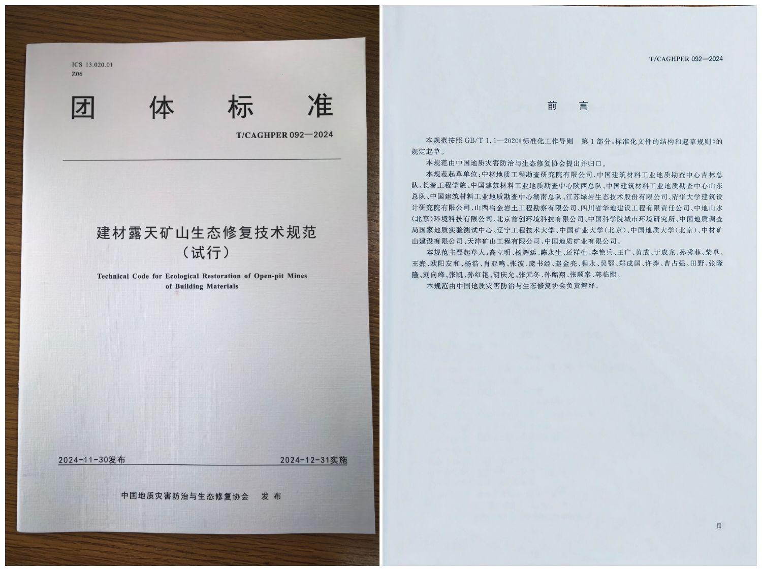 《规范》由地勘院牵头,联合全国 20 家科研院所(中国科学院城市环境研究所等)、高校(中国地质大学、中国矿业大学等)及技术企业(中材矿山建设有限公司、中国地质矿业有限公司等)共同编制。自2021年4月启动以来,工作组深度调研多地建材露天矿山、生态修复等典型案例,融合多项法律法规和技术标准要求,历经大纲评审、多轮技术审查和广泛征求意见修订,最终于2024年完成编制,并作为协会2024年“标准规范编制重要进展”成果之一,在本次会议正式发布。